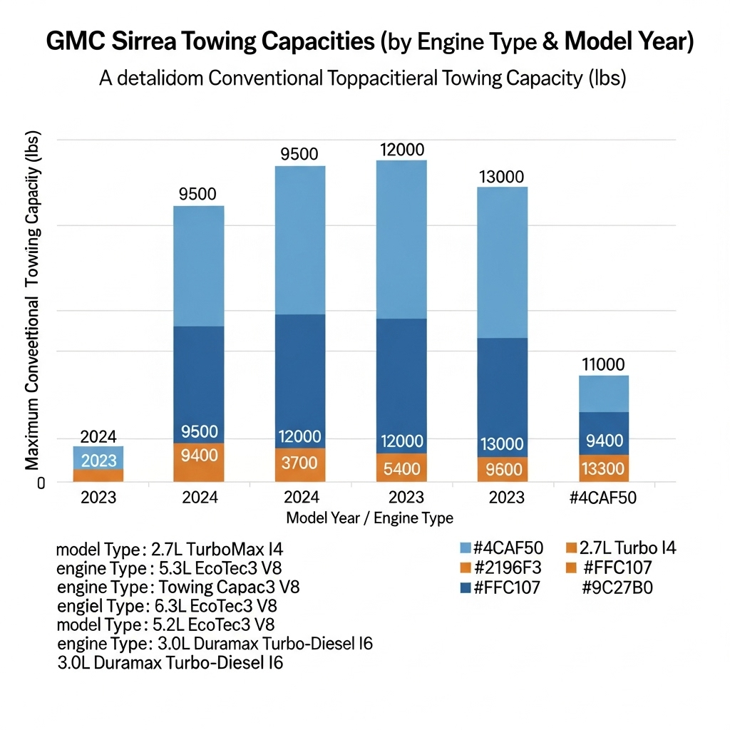 Understanding the towing capacity of the GMC Sierra 1500 is crucial for planning your towing needs. The towing capacity varies based on the engine type and model year. Below is a detailed chart that outlines the towing capacities for different configurations of the Sierra 1500, including the 5.3L and 6.2L engines.